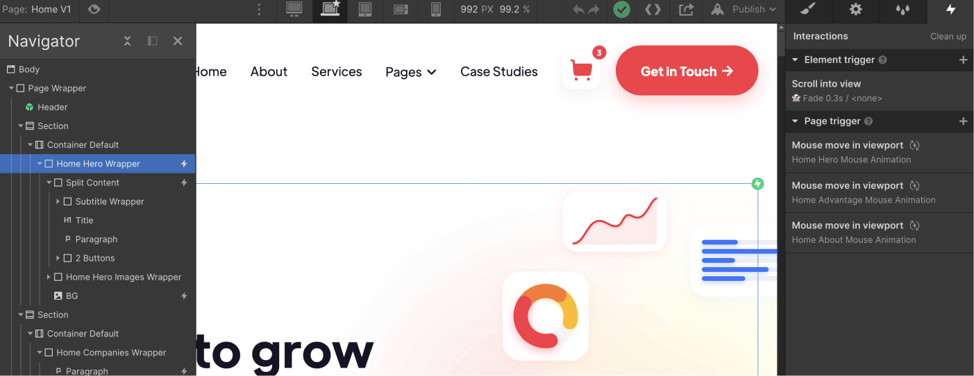 If you would like to edit any template Interaction (i.e. removing a appear effect), you can easily identify elements that have interactions as these have a small Interactions icon (a small thunder) in the left sidebar Navigator.